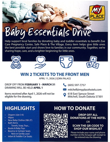 Event Description:Join My Place Hotels – Mitchell in making a difference for families in our community! We’re hosting a Baby Essentials Drive to benefit Zoe Care Pregnancy Center, Safe Place & The Village. Every donation helps give little ones the best possible start while sharing hope, care, and support with local families.