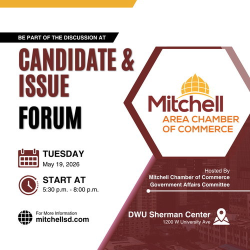 The forum will be held on Tuesday, May 19, at the DWU Sherman Center beginning at 5:30 p.m. The forum will begin with the City Council candidates, then the Mitchell School Board, and end with a discussion on the ballot issue. The forum is moderated by the Government Affairs Committee, and all candidates will answer the same questions asked by our media panel and have the same amount of time.