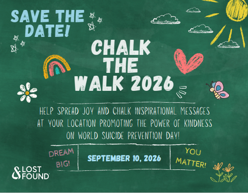 Chalk the Walk is a statewide initiative led by Lost&Found to raise awareness during Suicide Prevention Month and spread messages of hope, kindness, and support. Taking place on Thursday, September 10, 2026 (World Suicide Prevention Day), businesses and organizations are invited to participate by chalking encouraging messages at their locations.