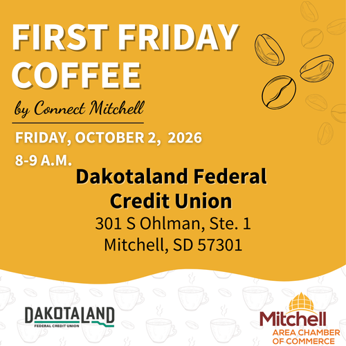 The Connect Mitchell Committee of the Mitchell Chamber invites you to a First Friday Coffee hosted by Dakotaland Federal Credit Union on Friday, October 2, from 8:00 to 9:00 a.m.