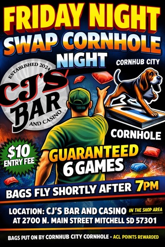 Name: Friday Night Cornhole SwapDate: March 20, 2026Time: 6:45 PM - 10:00 PM CDT