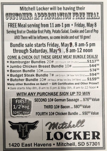 Mark your calendar and stop out to the Mitchell Locker Friday May 8th for our customer appreciation meal and Bundle Blowout Sale!