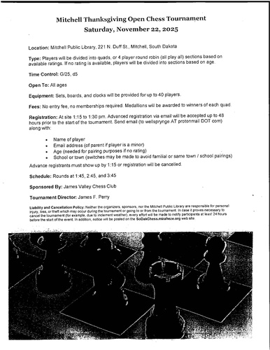 Join us for the Mitchell Thanksgiving Open Chess Tournament at the Mitchell Public Library!