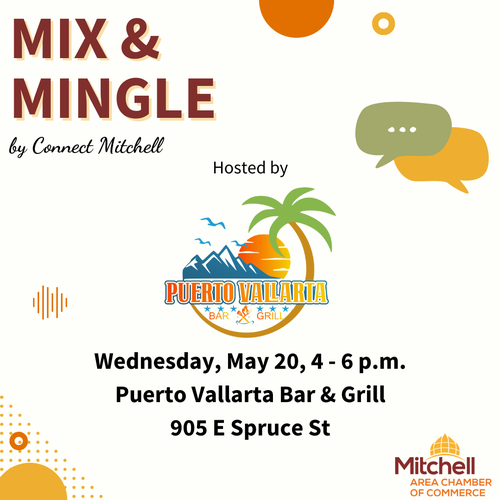 Event Description:Join the Chamber Connect Mitchell Committee for a Mix & Mingle on Wednesday, May 20 from 4–6 p.m. at Puerto Vallarta (905 E Spruce St.)!