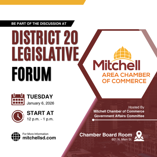 Name: Pre-Legislative Forum with District 20 LegislatorsDate: January 6, 2026Time: 12:00 PM - 1:00 PM CSTEvent Description:Join the Mitchell Government Affairs Committee of the Mitchell Area Chamber of Commerce for a Pre-Legislative Forum featuring our District 20 Legislators.