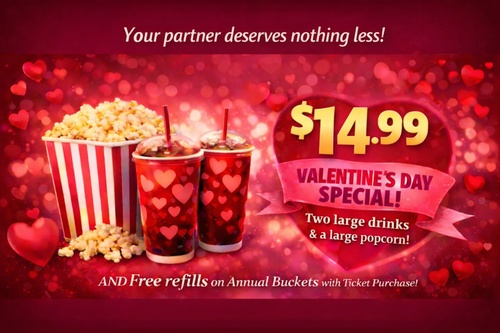 2 Large drinks + 1 large hot buttered popcorn just $14.99!