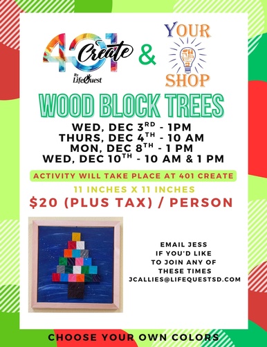 Event Description:Get into the holiday spirit with a hands-on, colorful crafting experience! Join 401 Create by LifeQuest and Your Shop for a festive Wood Block Trees Workshop, where you’ll design and build a vibrant 11" x 11" framed wood block tree using your own choice of colors.